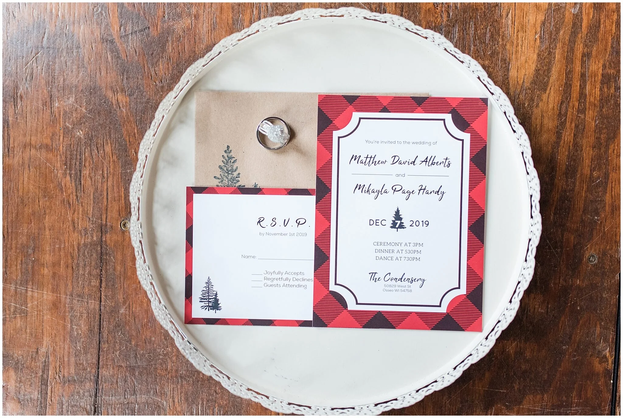 Mikayla and Matt were looking for a rustic but chic invite design that embodied their wedding theme of buffalo plaid and script lettering.